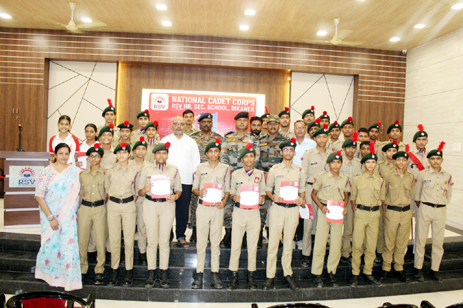 Bikaner Abhayindia.com The School’s NCC Cadets were presented with A Certificates by Colonel Johnny Thomas, Commander of the 7th Raj Battalion, NCC Bikaner, at an event hosted at the Auditorium of RSV Higher Secondary School, Jayanarayan Vyas Colony. Happiness on the faces of the cadets was palpable after receiving the “excellent” certificate. Colonel Thomas urged the students to remain committed to the country and embrace the goals of the NCC in their lives.