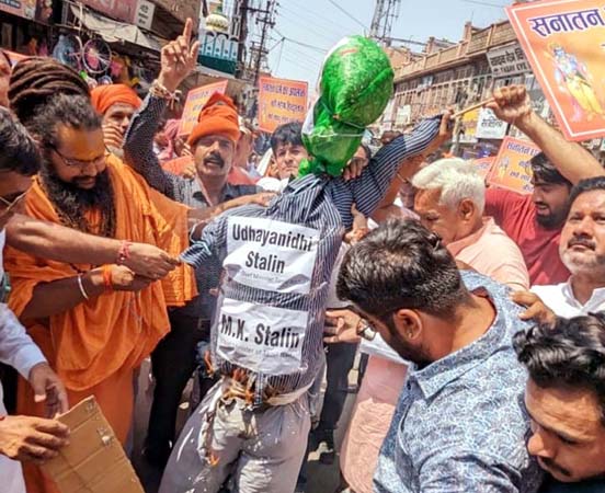 रामझरोखा कैलाशधाम के पीठाधीश्वर सरजूदास महाराज ने कहा कि यह प्रदर्शन केवल चेतावनी ही नहीं बल्कि एक प्रचंड का आरंभ है। युद्ध की शुरुआत है उन लोगों के खिलाफ जो सनातन धर्म की बुराई करते हैं, जो सनातन पर अभद्र टिप्पणियां करते हैं। मंगलवार को संत समाज व सनातन धर्म के अनुयायियों ने जेल रोड से पैदल रैली निकालते हुए कोटगेट पहुंचे और सीएम के बेटे का पुतला फूंक प्रदर्शन किया तथा जिला कलक्टर को ज्ञापन दिया गया।