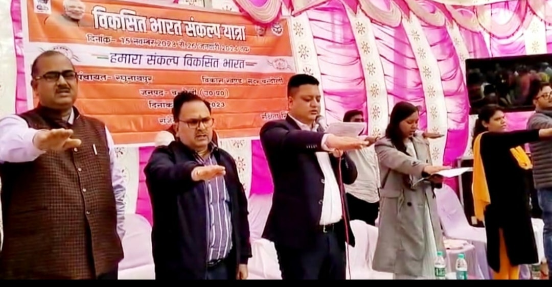 इस दौरान कार्यक्रम में उपस्थित जिलाधिकारी चंदौली निखिल टी फुंडे ने लाभार्थियों तथा ग्रामीणों को हमारा संकल्प विकसित भारत का शपथ दिलाया । कार्यक्रम में विभिन्न विभागों के स्टाल लगाए गए थे जिनका जिलाधिकारी ने निरीक्षण किया । इसके पूर्व उन्होंने मा सरस्वती के तैलचित्र पर माल्यार्पण कर कार्यक्रम का उद्घाटन किया । कार्यक्रम में बड़े टेलीविजन पर वीडियो कांफ्रेंसिंग को प्रसारित किया गया । प्रधानमंत्री मोदी दिल्ली से कई राज्यों के लाभार्थी से वीडियो कॉन्फ्रेंसिंग के माध्यम से जुड़े और उनके अनुभवों के बारे में जाना । प्रसारण के दौरान कार्यक्रम में जुटे लोगों ने उनकी बातें ध्यानपूर्वक सुनी ।