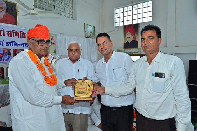 Bikaner/ Abhayindia.com जाट मैरिज ब्यूरो बीकानेर की ओर से आज जाट धर्मशाला बीकानेर में जाट समाज के अनमोल रतन बुद्धिजीवी उद्योगपति राजनीतिक जनप्रतिनिधियों व जिन्होंने अपने बेटों की शादी में दहेज न लेकर शगुन के रूप में एक रूपया नारियल लेकर शादी करवाने वाले 51 उन लोगों को सम्मानित किया गया जिन्होंने जाट समाज से दहेज रूपी कुरूति को रोकने के लिए अपनी अहम भूमिका निभाते हुए जाट समाज को अमूल्य योगदान देकर प्रेरणा स्त्रोत बनें। कार्यक्रम की शुरूआत जाट समाज के कुल देवता सत्यवादी वीर तेजाजी महाराज की प्रतिमा के सामने दीप प्रजवल्लित करके की गई।
