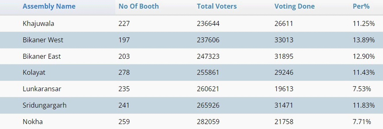 इसी तरह दूसरे नंबर पर बीकानेर पूर्व सीट पर 12.90 प्रतिशत मतदान हुआ है। वहीं, श्रीडूंगरगढ में 11.83 प्रतिशत, कोलायत में 11.43 प्रतिशत, खाजूवाला में 11.25 प्रतिशत, नोखा में 7.71 प्रतिशत तथा लूनकरणसर में 7.53 प्रतिशत मतदान हुआ है।