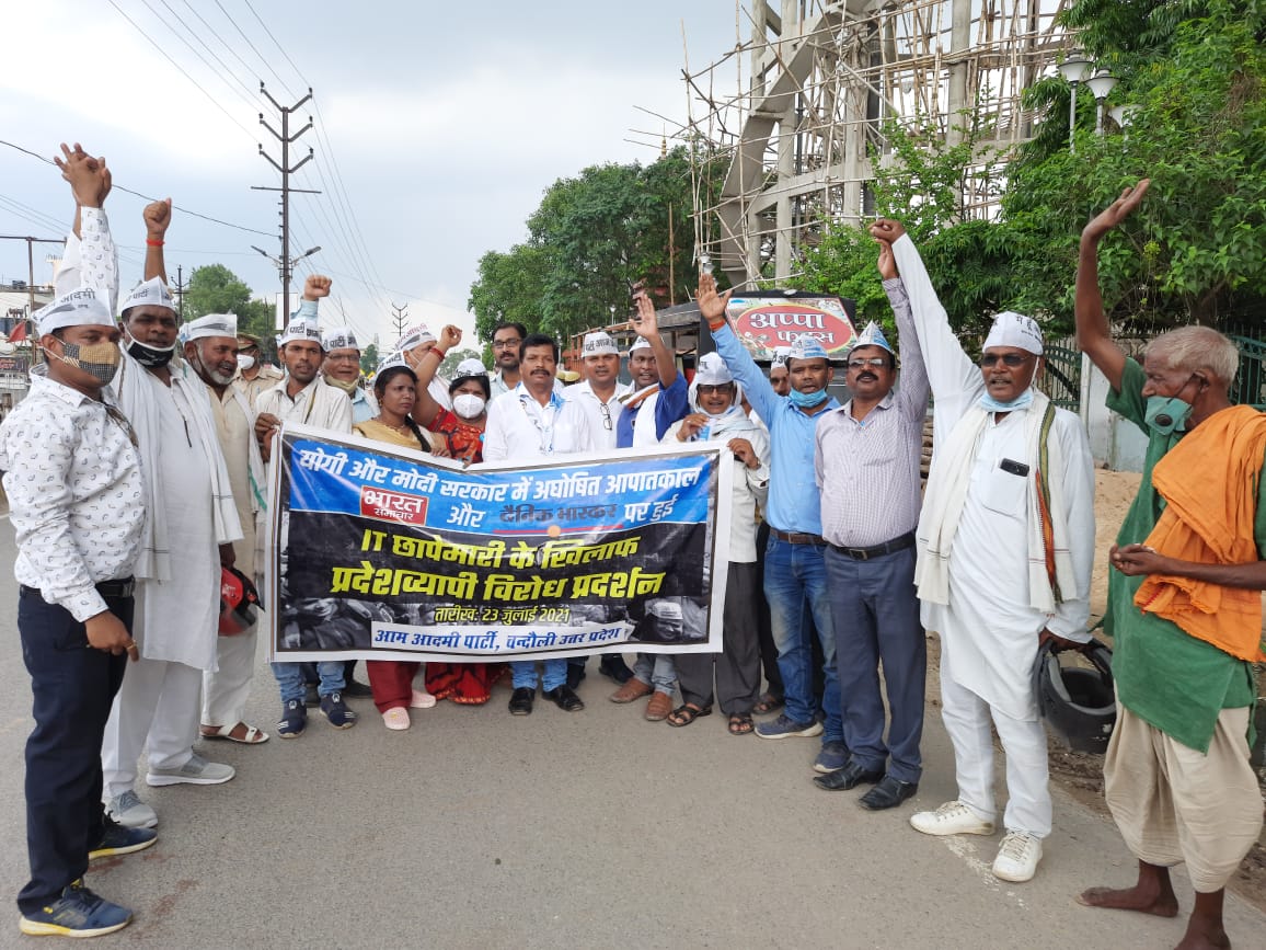चंदौली । प्रदेश नेतृत्व के आह्वान पर आम आदमी पार्टी चंदौली ने आज सुभाष पार्क से जुलूस निकाला और नरेंद्र मोदी सरकार के इशारे पर आयकर विभाग द्वारा भारत समाचार चैनल व दैनिक भास्कर अखबार के दफ्तर पर इनकम टैक्स विभाग द्वारा की गई छापेमारी के विरोध में जमकर प्रदर्शन किया तथा केंद्र व राज्य सरकार के विरूद्ध नारेबाजी की । इस दौरान पुलिस से तिखी झडप व कहासुनी भी हुई ।