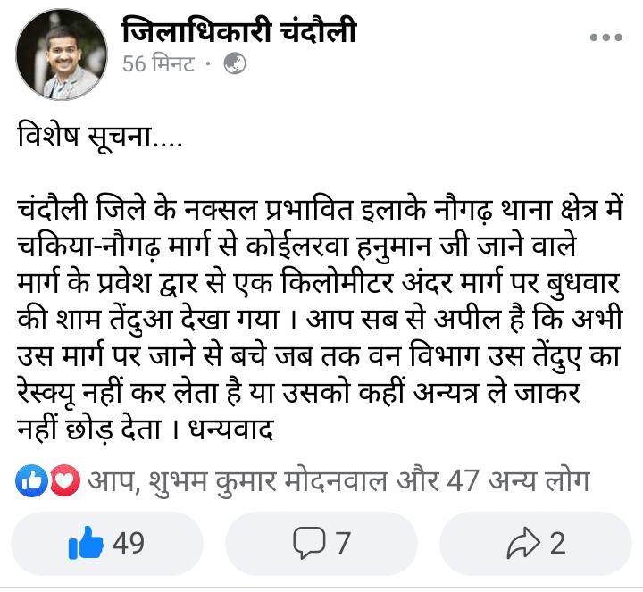 बुधवार को कोईलरवा हनुमान जी रास्ते में जाते समय वन विभाग के ही अधिकारियों की सड़क पर घुम रहे तेंदुए पर नजर पड गयी और अधिकारियों ने तेन्दुए का अपने मोबाइल से वीडियो बना लिया ।देखते ही देखते तेंदुए के सड़क पर घूमने का वीडियो सोशल मीडिया पर तेजी से वायरल हो गया । वन विभाग के कर्मचारियों ने ही तेंदुए का विडियो उच्चाधिकारियों को भेजते हुए अवगत कराया । मामले को संज्ञान में लेते हुए चंदौली डीएम संजीव सिंह ने जिले वासियों तथा सैलानियों से कुछ दिन के लिए उक्त रास्ते पर यात्रा न करने की अपील की । उन्होंने कहा जब तक तेंदुआ पकड़ में नहीं आ जाता तब तक उस रास्ते पर जाने से बचें ।जल्द ही उसे पकड़ने के लिए वन विभाग जंगलों में सर्च अभियान चलाएगा ।