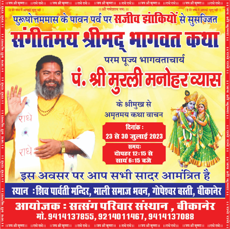 Bikaner Abhayindia.com A grand musical event Srimad Bhagwat Katha will be organized from 23 to 30 July at Shiv Parvati Temple, Mali Samaj Bhawan, Gopeshwar Basti, under the auspices of Satsang Parivar Sanstan, Bikaner in Purushotmas. This story will recite Amritmai Katha from Srimukh Param Pujya Bhagvatacharya Pt Murli Manohar Vyas. The religious inhabitants of the city are very enthusiastic about this story. The organization began preparations for this grand event. The timing of the story will be from 12.15 to 18.15. The month of Purushottam is considered in the scriptures to be very auspicious in terms of Katha and other religious events, and one gets more benefit from the stories that take place in the month of Purushottam than in other months.