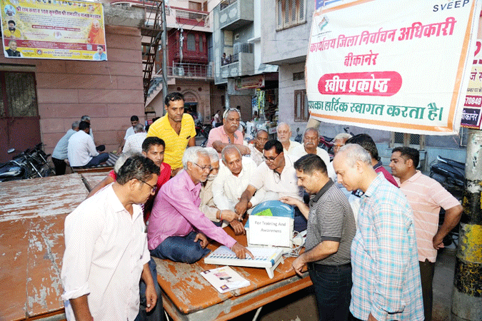 Bikaner. Abhayindia.com शहरी मतदाताओं को ईवीएम वीवीपीएटी की कार्यप्रणाली से जागरूक करने सहित चुनाव से जुड़ी जानकारी उपलब्ध करवाने के उद्देश्य से रविवार को आचार्यों के चौक में पाटा चौपाल आयोजित हुई। इस दौरान स्टेट लेवल मास्टर ट्रेनर डॉ. वाईबी माथुर, एएलएमटी हरिहर राजपुरोहित, मोहम्मद अयूब और मोहम्मद आरिफ ने स्थानीय नागरिकों को मतदान से जुड़ी जानकारी दी।