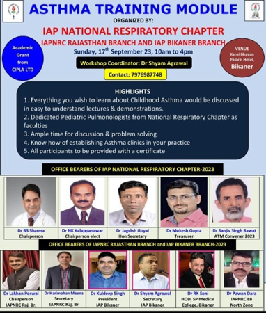 बीकानेर पीडियाट्रिक सोसायटी के अध्यक्ष डॉ. कुलदीप सिंह बिट्ठू ने बताया कि कार्यक्रम में भारत भर के शिशु रोग विशेषज्ञ अस्थमा के बारे में बेहतर इलाज व प्रबंधन कर पाएंगे। कार्यक्रम में विशेष अतिथि डॉ. पी.सी. खत्री होंगे।