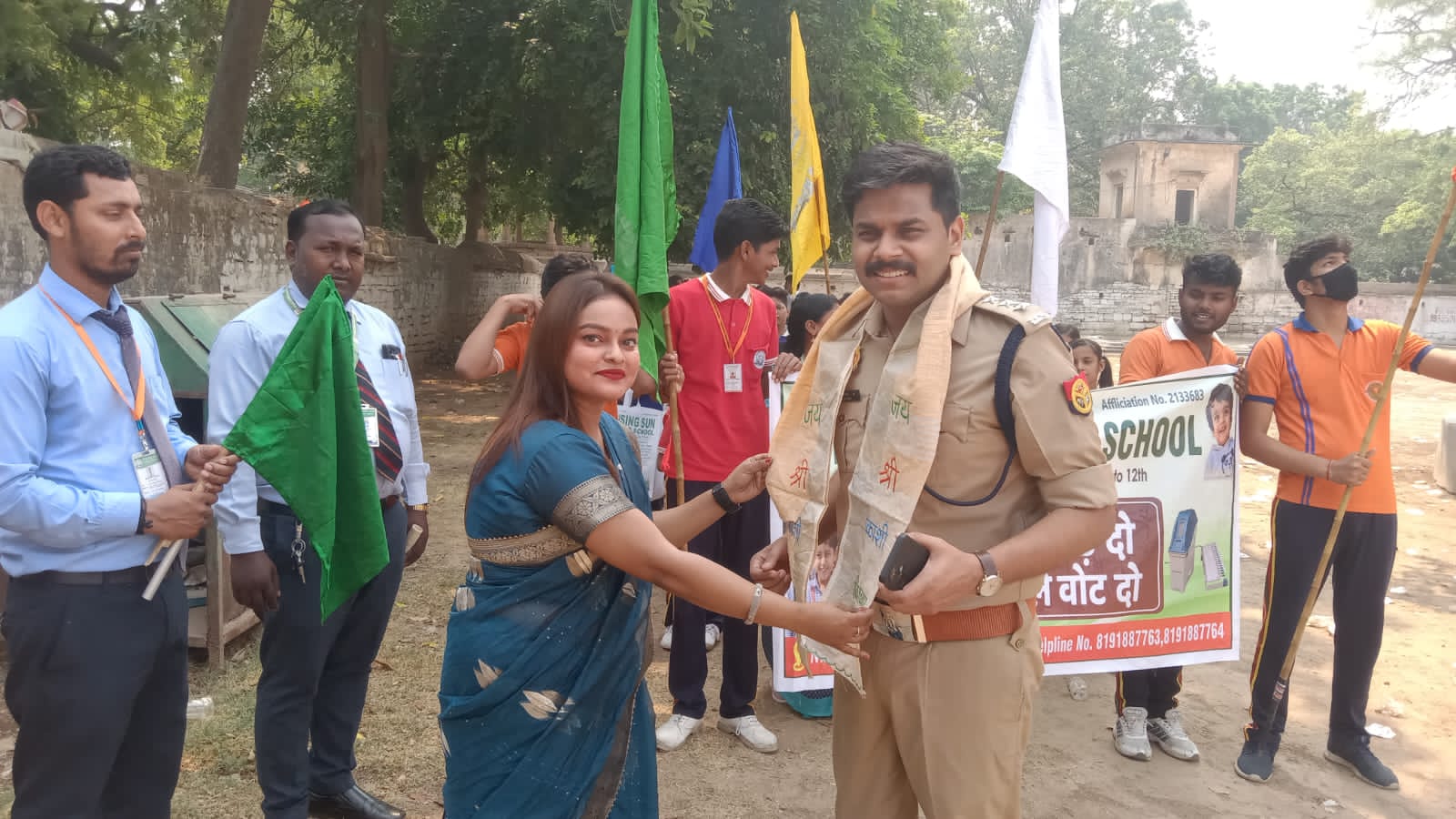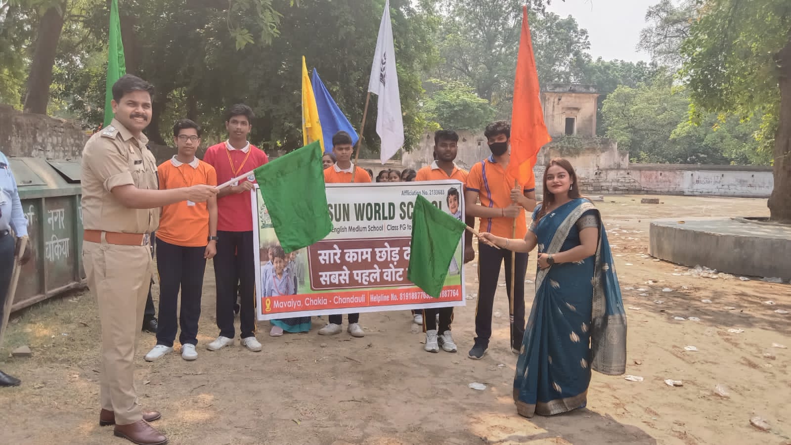 बबुरी चंदौली । क्षेत्र के मवैया गांव स्थित राइजिंग सन वर्ल्ड स्कूल में स्कूल के बच्चो द्वारा सोमवार को “मतदाता जागरूकता अभियान” के तहत मतदाता जागरूकता रैली निकाली गयी । रैली को मुख्य अतिथि क्षेत्राधिकारी चकिया आशुतोष कुमार त्रिपाठी ,एस.एच.ओ अतुल प्रजापति तथा वृक्ष बंधु डा. परशुराम सिंह ने हरी झंडी दिखाकर रवाना किया ।