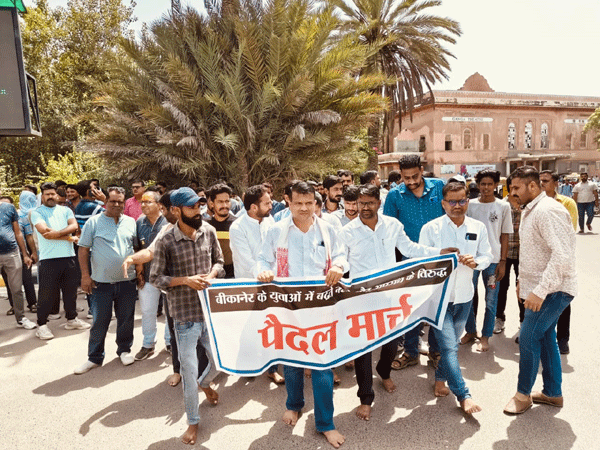 Bikaner. Abhayindia.com शहर की बदहाल कानून व्यवस्था, नशीले पदार्थों की बेरोकटोक बिक्री और बढ़ते अपराध के विरोध में राजस्थान भाजपा के प्रदेश प्रवक्ता डॉ सुरेंद्र सिंह के नेतृत्व में नौजवानों ने गांधी पार्क स्थित गांधी स्टैचू से रवाना होकर एसपी कार्यालय तक नंगे पांव पैदल मार्च निकाला।