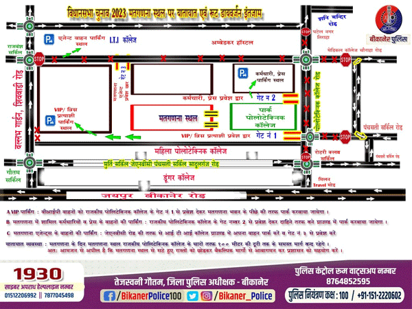 बीकानेर Abhayindia.com बीकानेर में विधानसभा चुनाव के मतगणना दिवस पर 03.12.2023 को देखते हुए राजकीय पोलिटेक्निक कॉलेज भवन (मतगणना स्थल) में यातायात एवं पार्किंग व्यवस्था निर्धारित की गई है।
