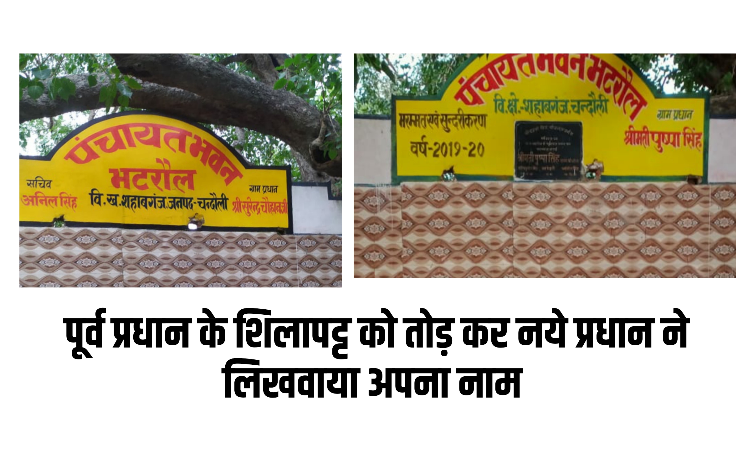 चंदौली । शहाबगंज विकासखंड के भटरौल गांव में पूर्व प्रधान द्वारा सामुदायिक शौचालय के निर्माण के दौरान लगाए गये शिलापट्ट को वर्तमान ग्राम प्रधान ने हटवा कर उसी स्थान पर अपना नाम लिखवा दिया । जिससे गाव मे रोष व्याप्त है । इस सम्बन्ध में पूर्व ग्राम प्रधान पुष्पा सिंह के पति संजीव सिंह ने डीपीआरओ ब्रह्मचारी दूबे से शिकायत की तथा माग किया कि इस मामले की जांच करा कर प्रधान के खिलाफ उचित कार्रवाई की जाय ।