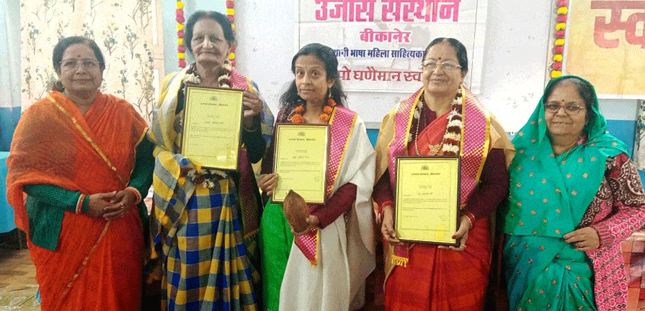 बीकानेर Abhayindia.com राजस्थानी भाषा,साहित्य और संस्कृति को समर्पित उजास संस्थान द्वारा शहर की तीन महिला साहित्यकारों को “उजास सृजन सम्मान” से सम्मानित किया गया। बहुआयामी साहित्यकार, शोधकर्ता और समाजसेवी डॉ. बसंती हर्ष को उनके द्वारा साहित्य की विविध विधाओं में बीस पुस्तकों के सृजन के लिए, कवयित्री यामिनी जोशी को उनके प्रथम काव्य संग्रह “भावों की सरगम” के प्रकाशन के लिए और हिंदी राजस्थानी और बांग्ला की साहित्यकार सुश्री पूर्णिमा मित्रा को उनके तीनों भाषाओं में पुस्तकों के सृजन के लिए सम्मानित किया गया।