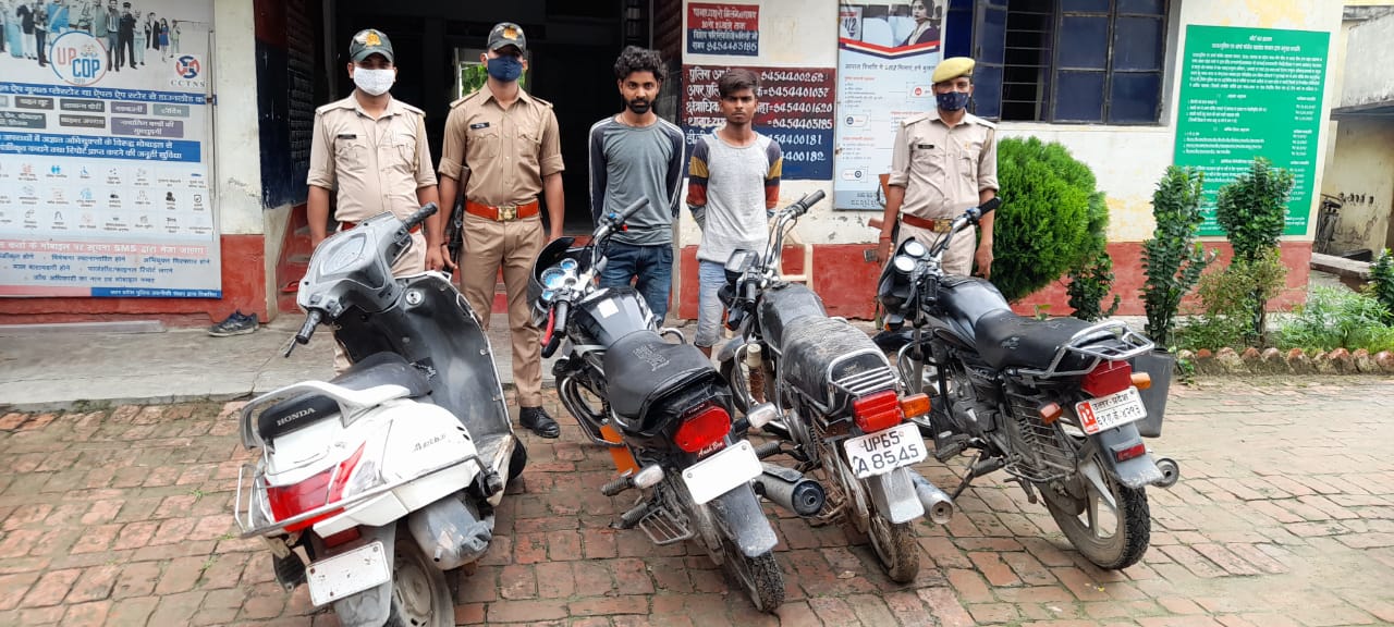 जानकारी के अनुसार धीना पुलिस ने मुखबीर की सूचना पर थाना क्षेत्र के जमुर्खा की तरफ से जाने वाली पुलिया के पास से तीन बाइक सवारों को रोकने का प्रयास किया । जिसमें दो को तो रोक लिया गया परन्तु एक व्यक्ति अपने वाहन को छोड़कर भागने में सफल रहा। मुखबिर द्वारा बताया गया था कि तीन व्यक्ति चोरी की तीन मोटरसाइकिलों को लेकर इसी रास्ते कहीं बेचने हेतु जाने वाले हैं। जिस पर पुलिस ने मौके पर घेराबंदी कर दो लोगों को पकड़ने में कामयाबी हासिल की। गिरफ्तार अभियुक्तों से पूछने पर बताया गया कि हम लोग मोटरसाइकिलों की चोरी करते हैं तथा चोरी हुई मोटरसाइकिल को छिपा कर रख देते हैं और ग्राहक की तलाश कर उन्हें अच्छे दामों पर बेच देते हैं। उन लोगों ने बताया कि यह तीनों मोटरसाइकिल चोरी की है जिसे हम लोग मिर्जापुर कचहरी तथा भुड़कुड़ा गाज़ीपुर तथा चंदौली से चोरी किए हैं। पकड़े गए व्यक्तियों से कड़ाई से पूछताछ की गई तो उन लोगों ने बताया गया कि एक सफेद रंग की और स्कूटी है जिसे हम लोग चोरी करके लाए थे और बेचने के लिए कमालपुर पंचायत भवन के पास कोने में छुपा कर रखे हैं।उक्त व्यक्ति द्वारा बताए गए स्थान पर पुलिस ने पहुंच पंचायत भवन के पास बाहर कोने में एक सफेद रंग की बिना नंबर प्लेट की एक्टिवा 3G बरामद की। बरामद चारों वाहनों को कब्जे में लेने के बाद पुलिस ने स्थानीय थाने पर मुकदमा अपराध संख्या 45/2021 धारा 379/411/413/414भादवी पंजीकृत कर आवश्यक कार्रवाई में जुटी है। पुलिस ने गिरफ्तार अभियुक्तों का नाम युसूफ अली निवासी हेतमपुर थाना धानापुर चंदौली तथा कबलतैन निवासी ग्राम मलेखर थाना मुगलसराय जनपद चंदौली बताया है। गिरफ्तार करने वाली टीम में थाना अध्यक्ष अतुल कुमार, उपनिरीक्षक दुर्गादत्त यादव, उपनिरीक्षक कपिल देव यादव, हेड कांस्टेबल संजय सिंह,कांस्टेबल रोहित यादव, कांस्टेबल राजेश यादव,कांस्टेबल शादाब, हेड कांस्टेबल आनंद सिंह, हेड कांस्टेबल राकेश यादव व कांस्टेबल अमित यादव क्राइम ब्रांच शामिल रहे।
