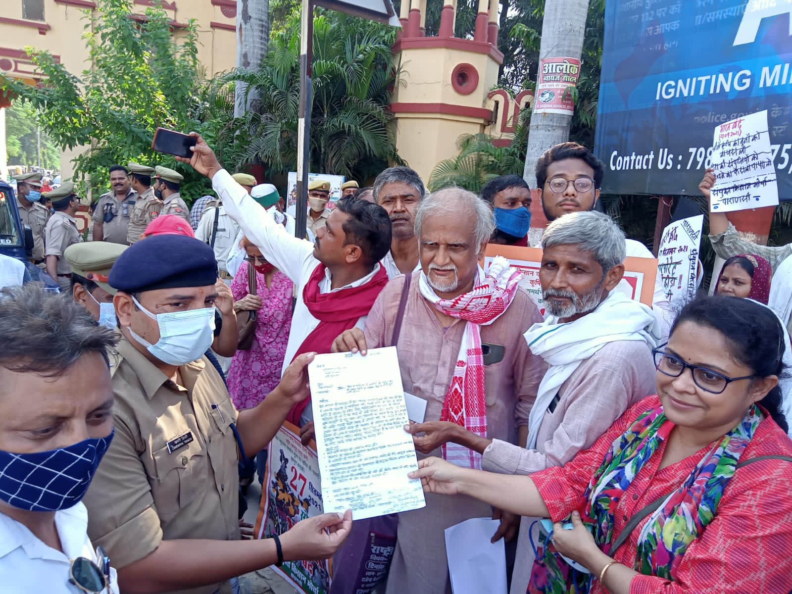 समाजवादी जनपरिषद के नेता अफलातून ने कहा कि सरकार सुनियोजित तरीके से  रोटी को उद्योगपतियों की कैद में रखना चाहती है ।भूख का सवाल केवल किसानों का ही नही बल्कि यह पूरे देश का सवाल है ।जिस पर किसानों के हक में खड़े होकर निजी कंपनियों के इशारे पर चलने वाली सरकार का मुकाबला करना होगा ।उन्होंने सुरक्षा में तैनात पुलिसकर्मियों को भी इस आन्दोलन का हिस्सा बनने के लिए आमंत्रित करते हुए कहा कि आप भी किसान परिवार से आते है रोटी का सवाल आपके लिए भी है ।जब आप पुलिस की नौकरी में आये इससे पूर्व भी आपने जो भी परीक्षाएं दिया उसमे भी संवैधानिक मूल्यों से जुड़े हुए सवाल आते है,जिससे आप लोग भी पूर्ण रूप से परिचित है और केंद्र एवं राज्य के विषय को भली-भांति समझते है ।देश की सुरक्षा के साथ – साथ नागरिकों के संवैधानिक मूल्यों की रक्षा करने का दायित्व भी आपका है ।इसलिए भारत बंद के समर्थन में हम सब संयुक्त किसान मोर्चा की ओर से आपका भी स्वागत करते है ।
