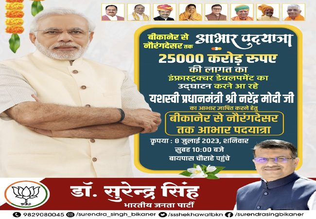 Abhar Padyatra convener Dr. Surendra Singh said that after independence, the prime minister would simultaneously put in place schemes worth about twenty-five thousand crores. This is a historic achievement for Bikaner. To congratulate this achievement, the youth will show their gratitude to Modi by walking. Saturday morning 10 The march will depart from the Jaipur bypass road and head towards the meeting point.